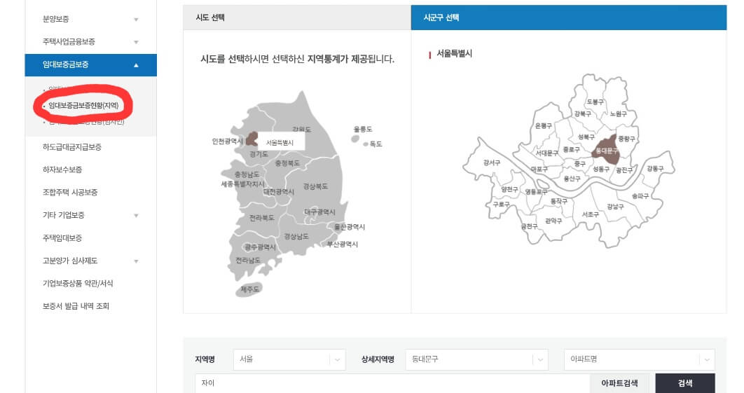 임대보증금보증 - 임대보증금보증현황(지역) 선택