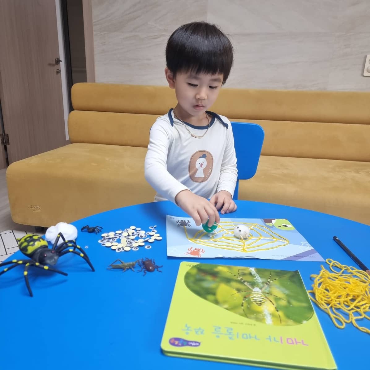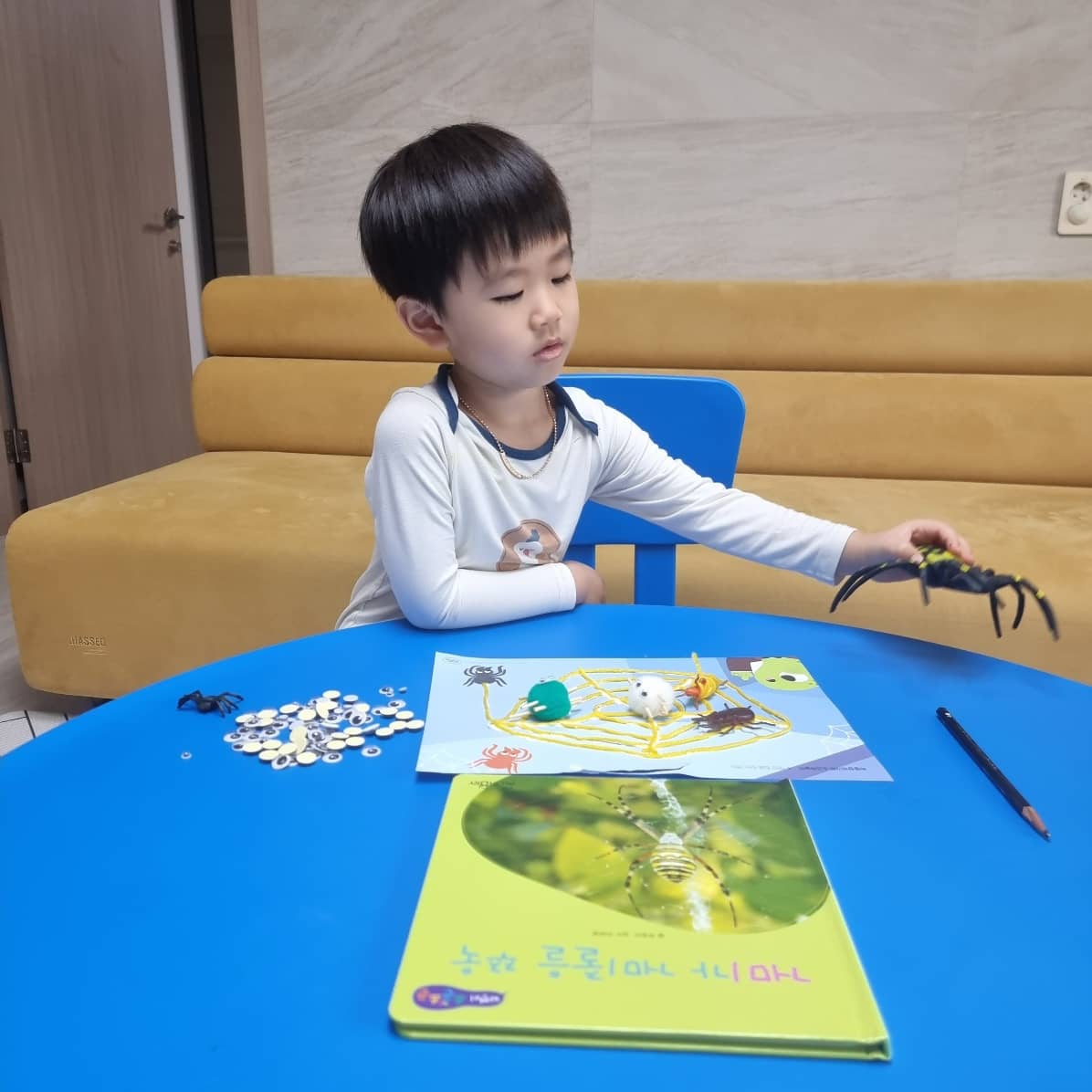 실과 목공풀, 그리고 각가지 문구용품을 이용하여 거미집을 직접 만들어 보며 재현해 보았고, 거기에 역할글을 통하여 거미줄에 걸려 먹이가 되는 과정 그리고 사냥하는 방법에 대하여 이야기를 해보는 시간을 가져보았습니다.