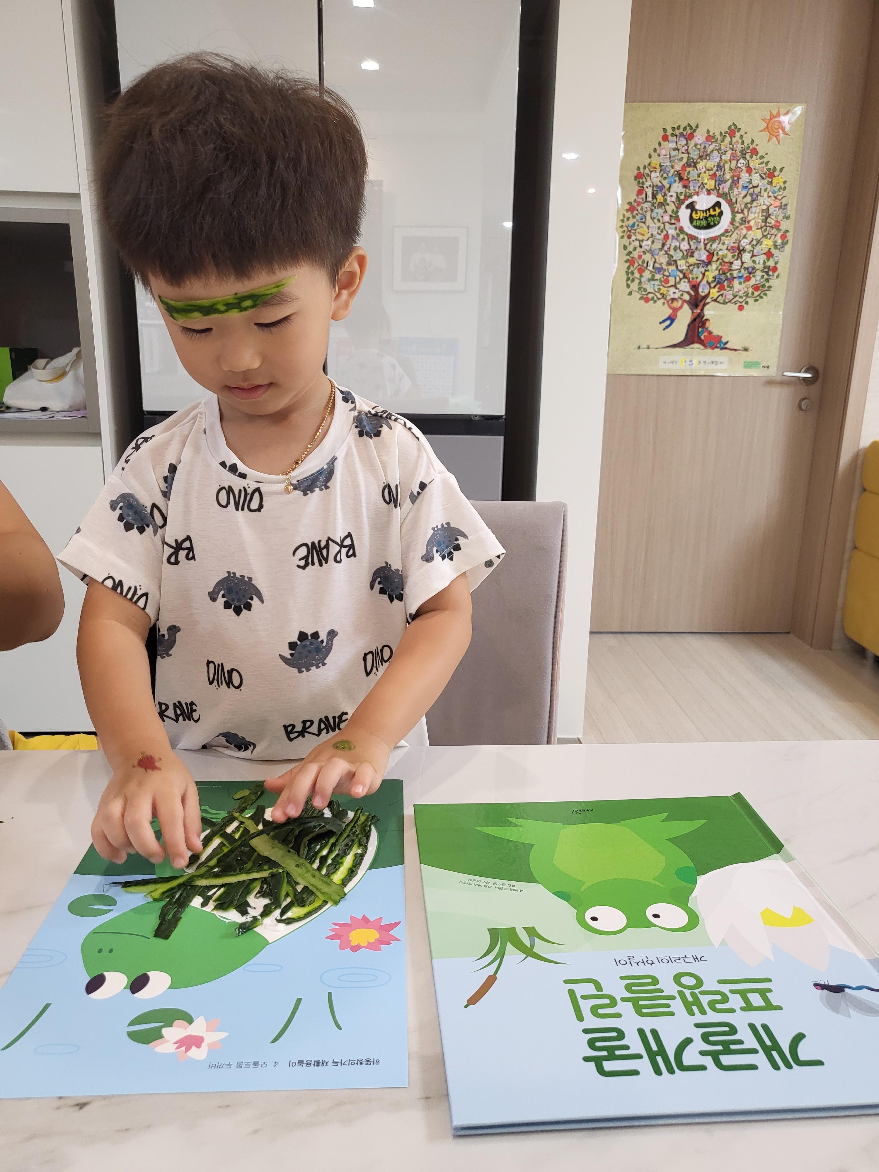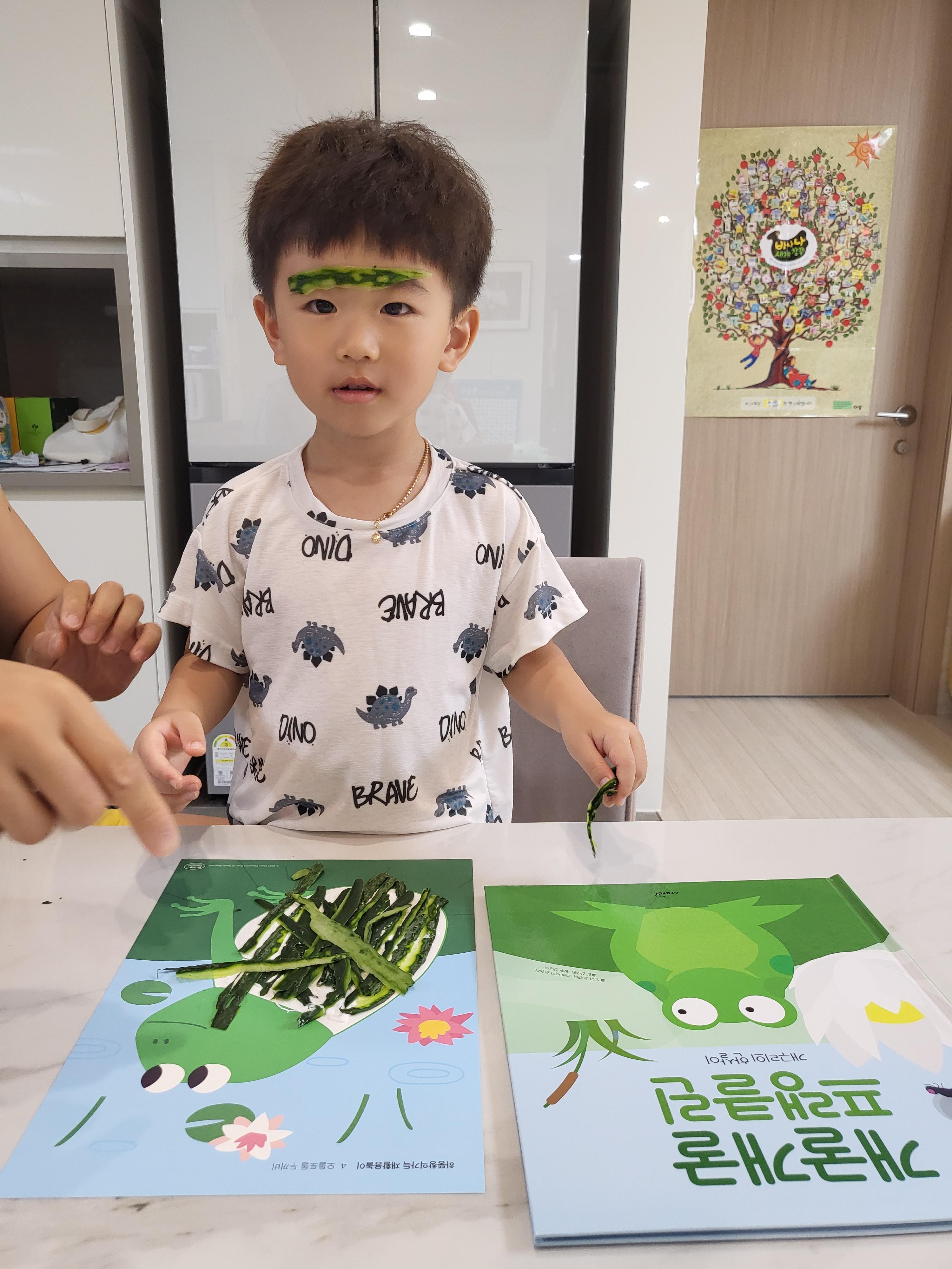 오이껍질을 이용하여 개구리를 만들며 독후활동을 진행하였습니다.