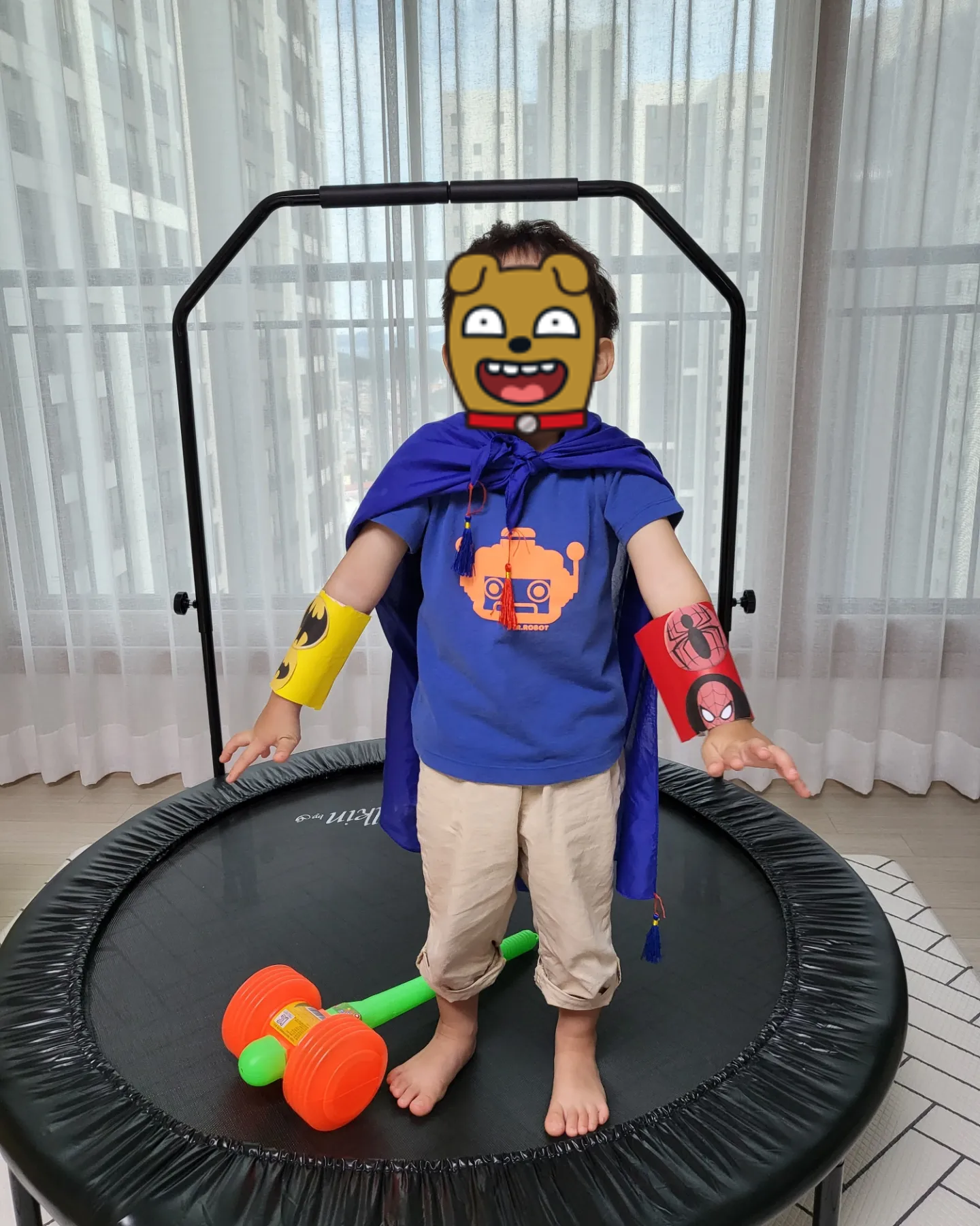슈퍼영웅 팔찌를 장착하고 집에있던 보자기를 목에 둘러주었는데