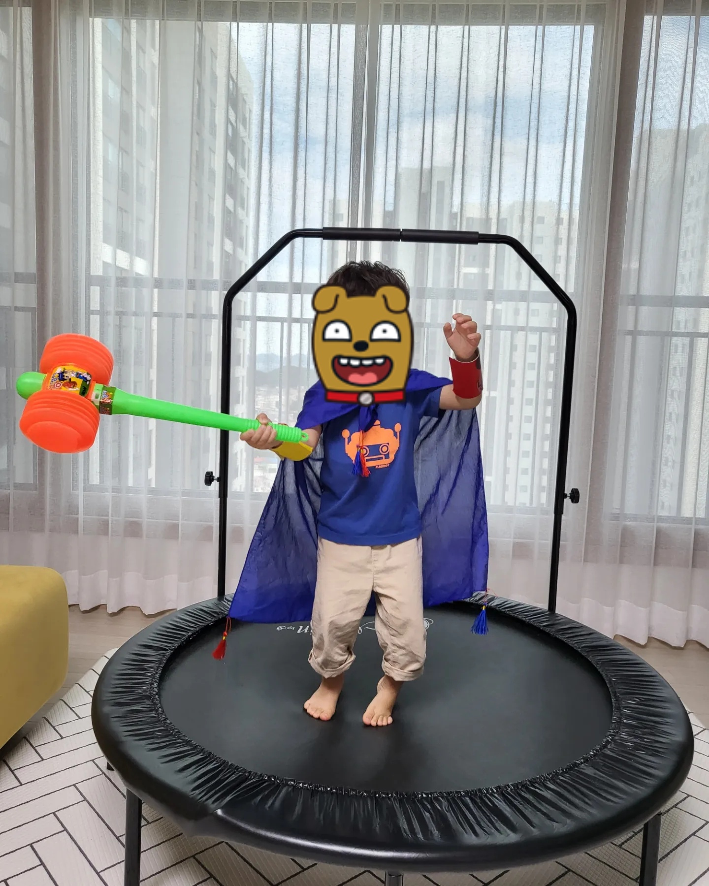 슈퍼맨으로 변신후 토르처럼 망치를들고 트램폴린 위를 누비는 귀여운 슈퍼맨 히어로 👍