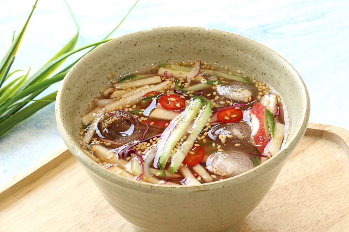 시원한 다시마 육수를 우려 시원하게 놔둔뒤 특유의 향긋한 냄새와 아삭한 식감으로 다양한 요리에 쓰이고있는 오이 깨소금 등등을 넣어 먹으면 상쾌함과 진한 육수의 조화가 일품이다.