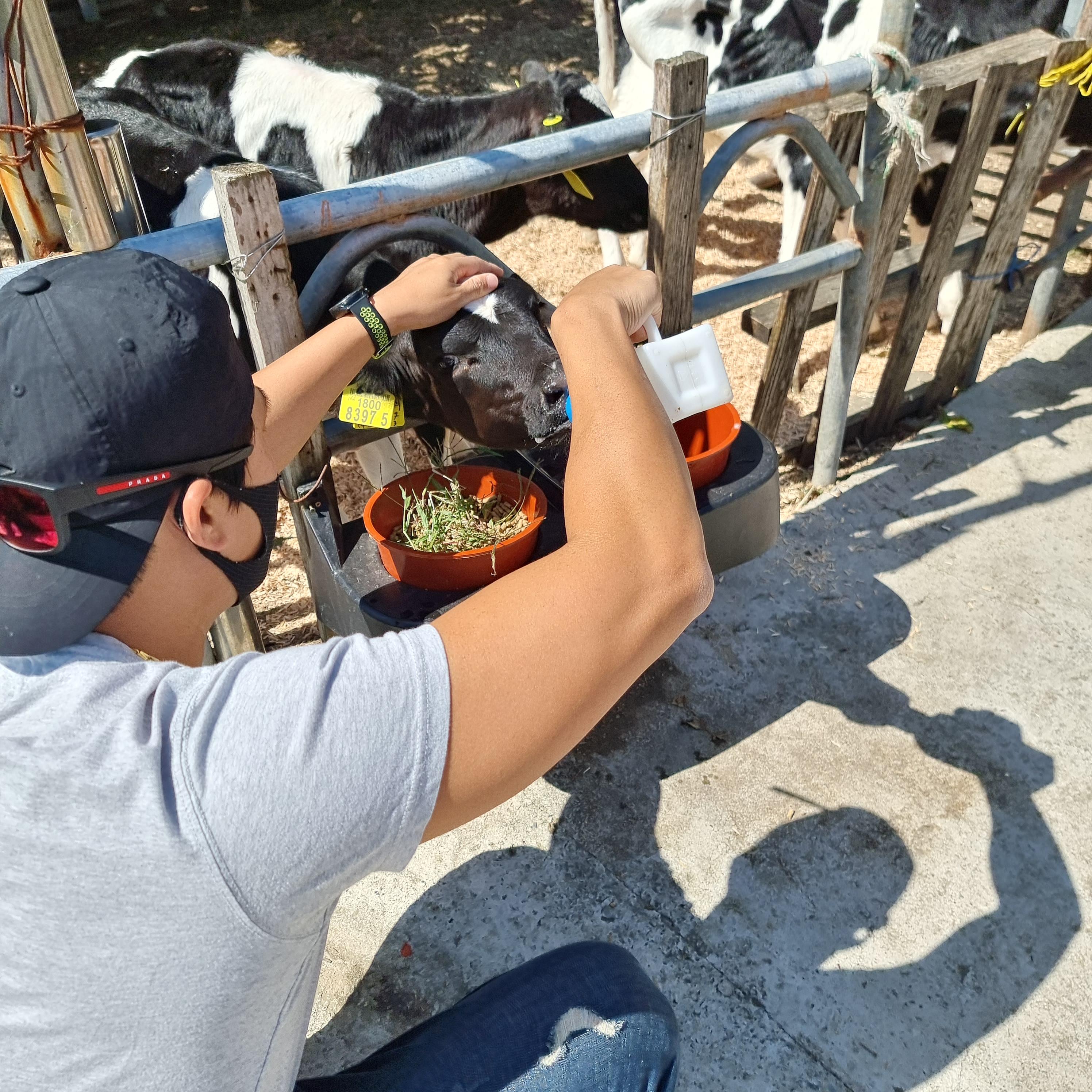송아지에게 우유를 먹여주며