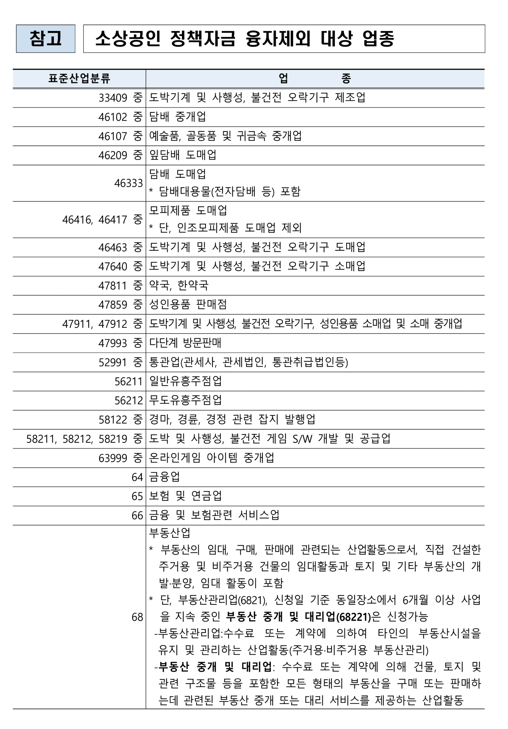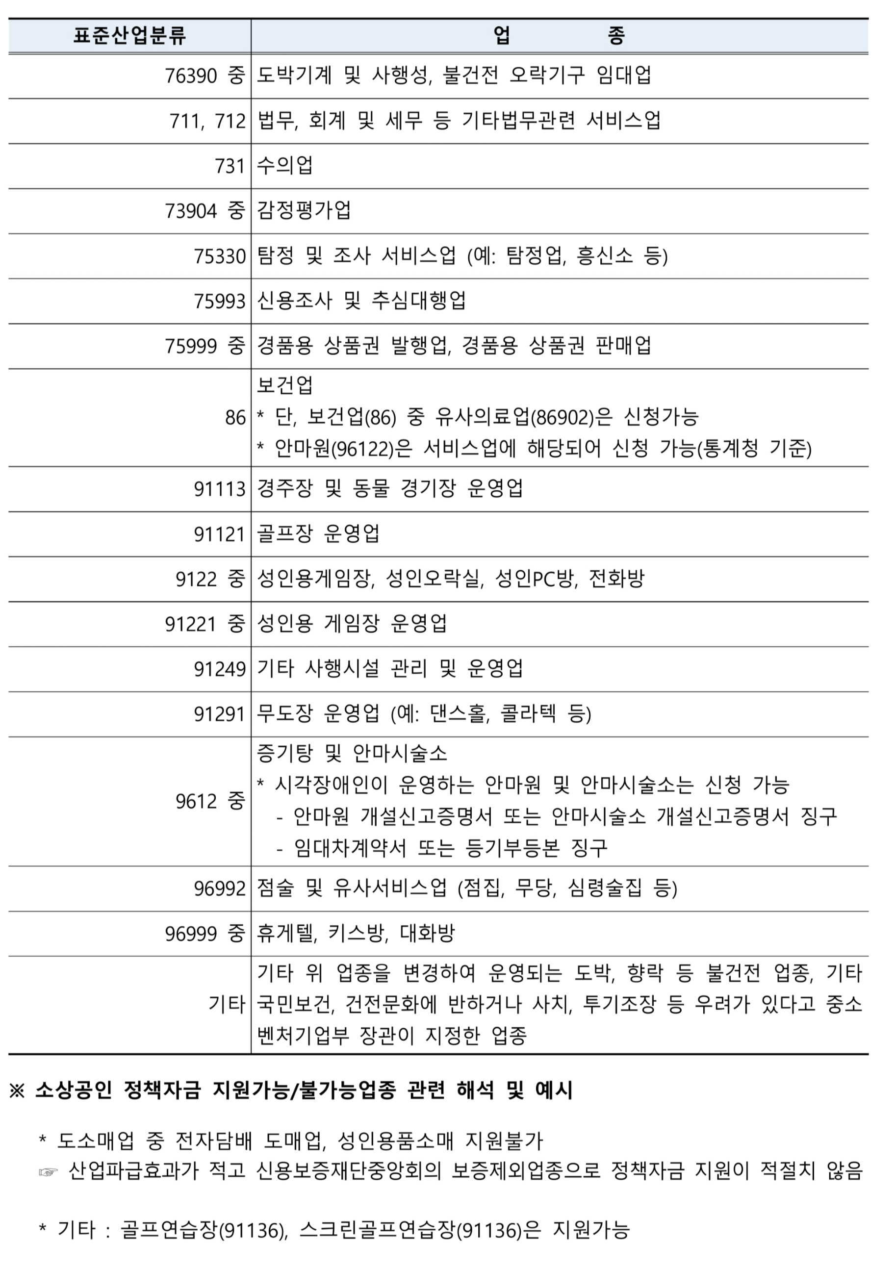 소상공인 정책자금 지원 제외 업종은 제외