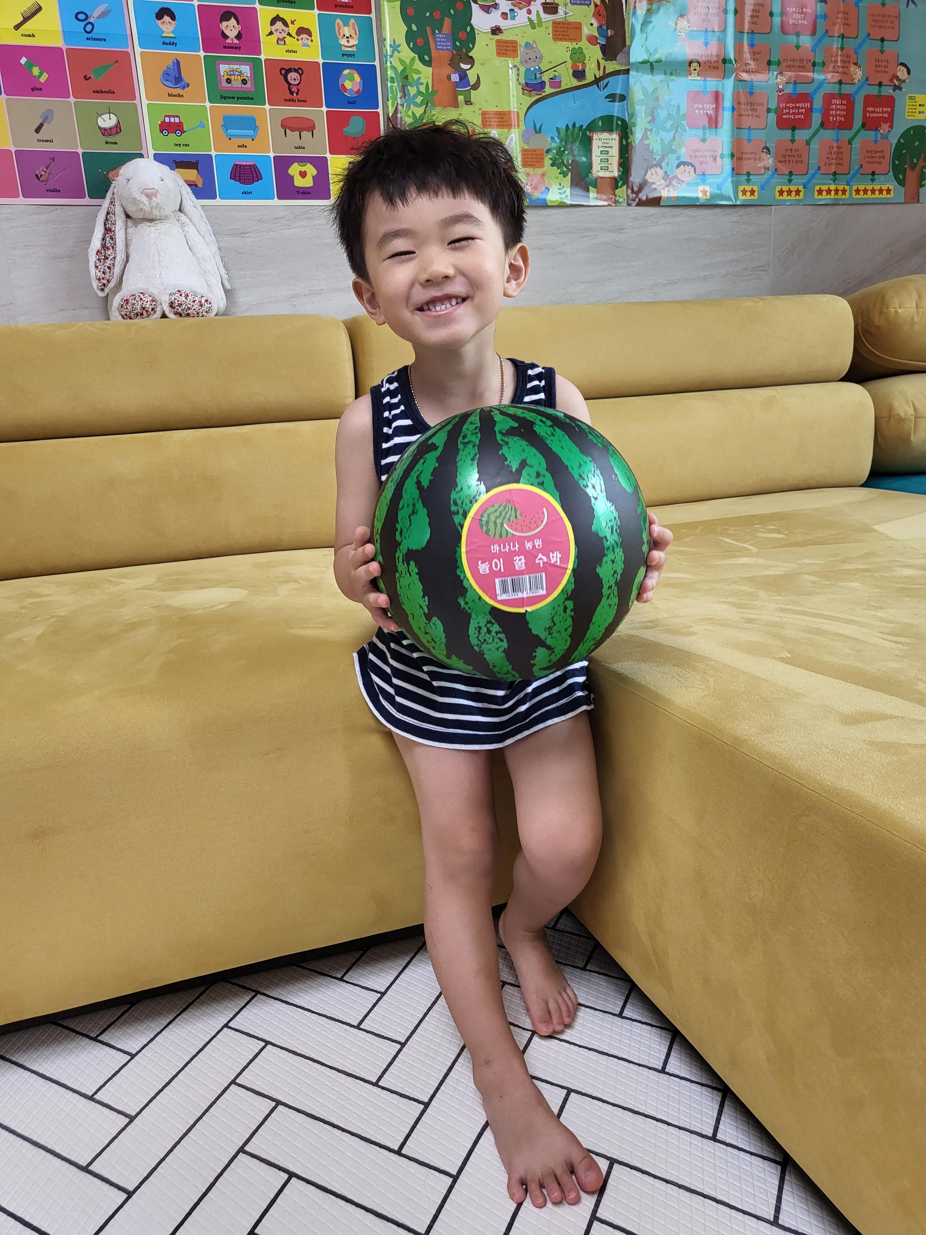 어린이집에서 복날이라고 선물로 준 진짜 수박 같은 '수박 비치볼'을 이용하여