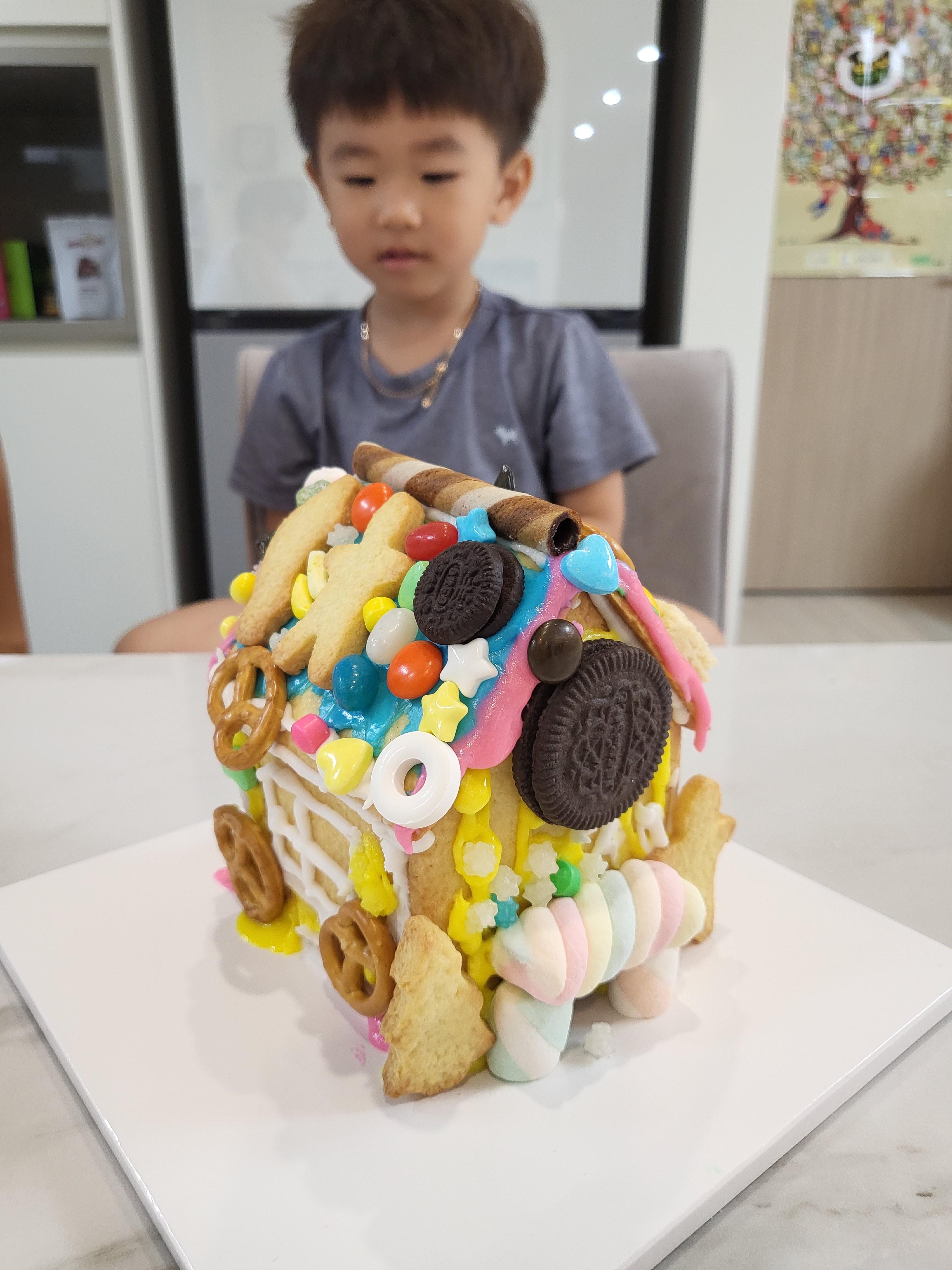 '그럼 우리 과자 집을 만들어 보자!' 대답한 후 과자집을 공수 하였습니다.(엄마쵝오)