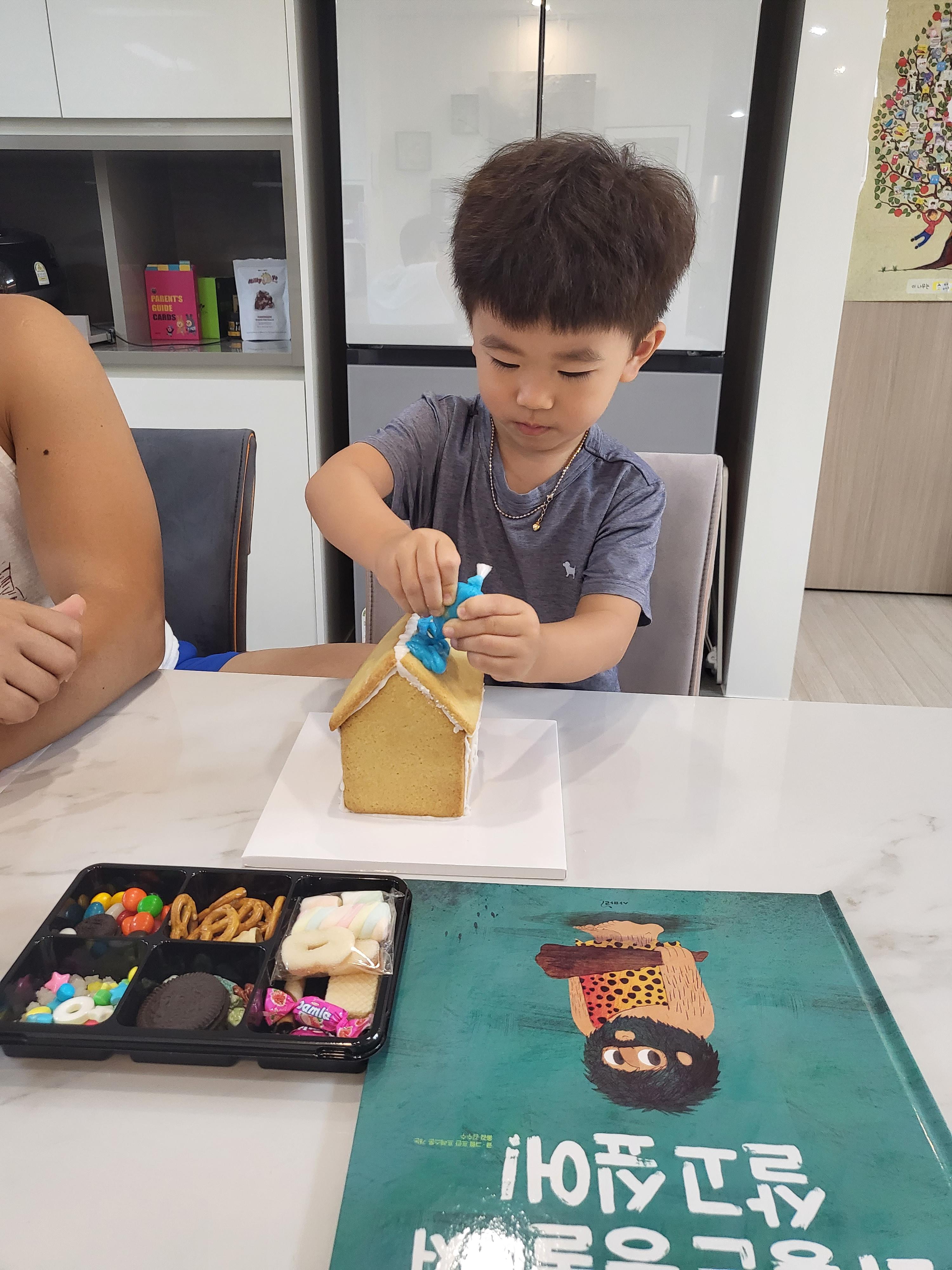 '그럼 우리 과자 집을 만들어 보자!' 대답한 후 과자집을 공수 하였습니다.(엄마쵝오)