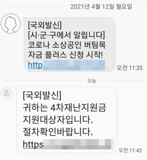 문자 내용을 살펴보면 '코로나19 장기화 장기화 또는 소상공인(자영업자·직장인) 및 근로자 민생 경제 회복을 위해