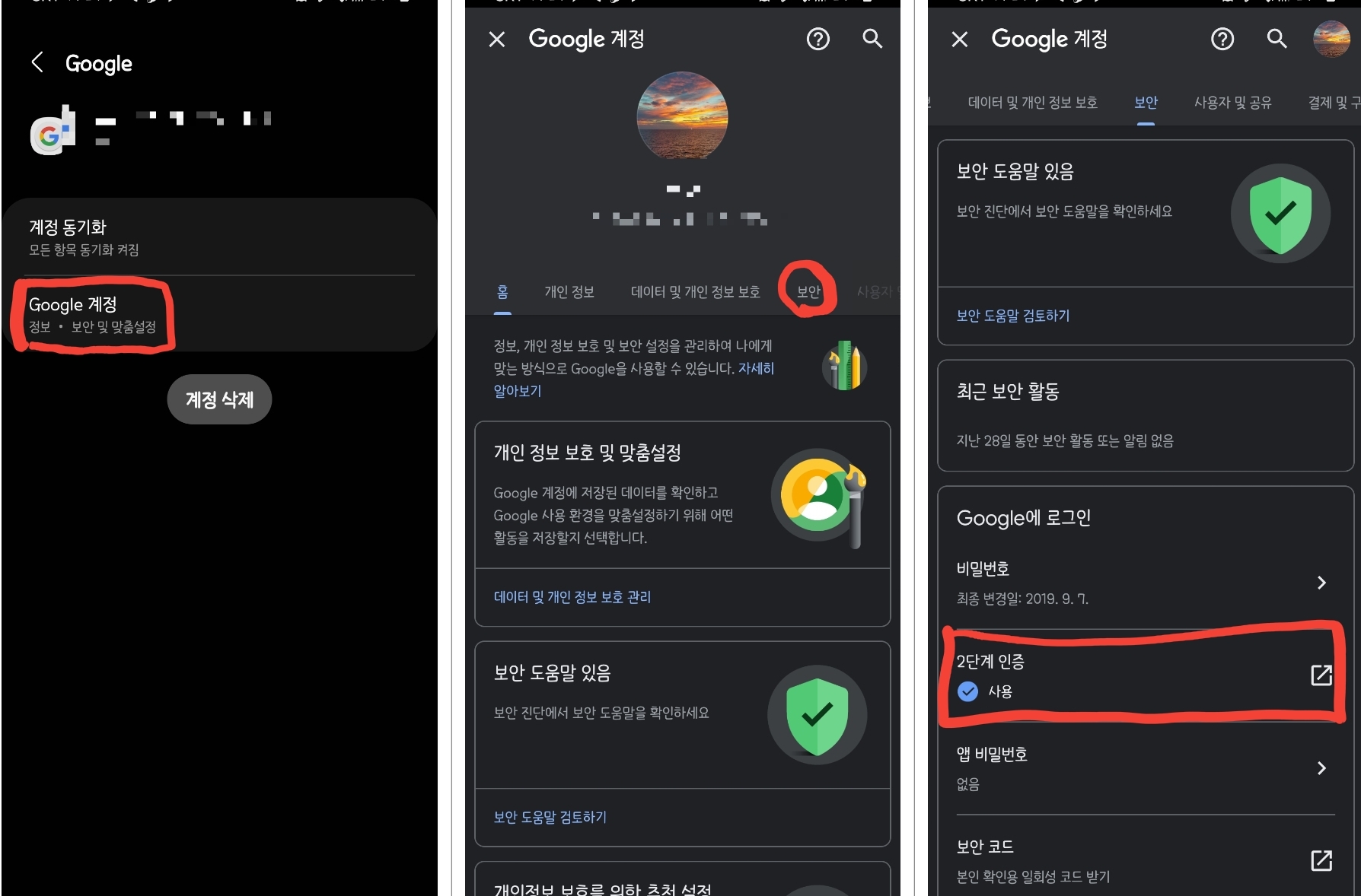 “계정(계정관리)”에서 구글 계정을 클릭하면 보안 탭을 클릭한다.