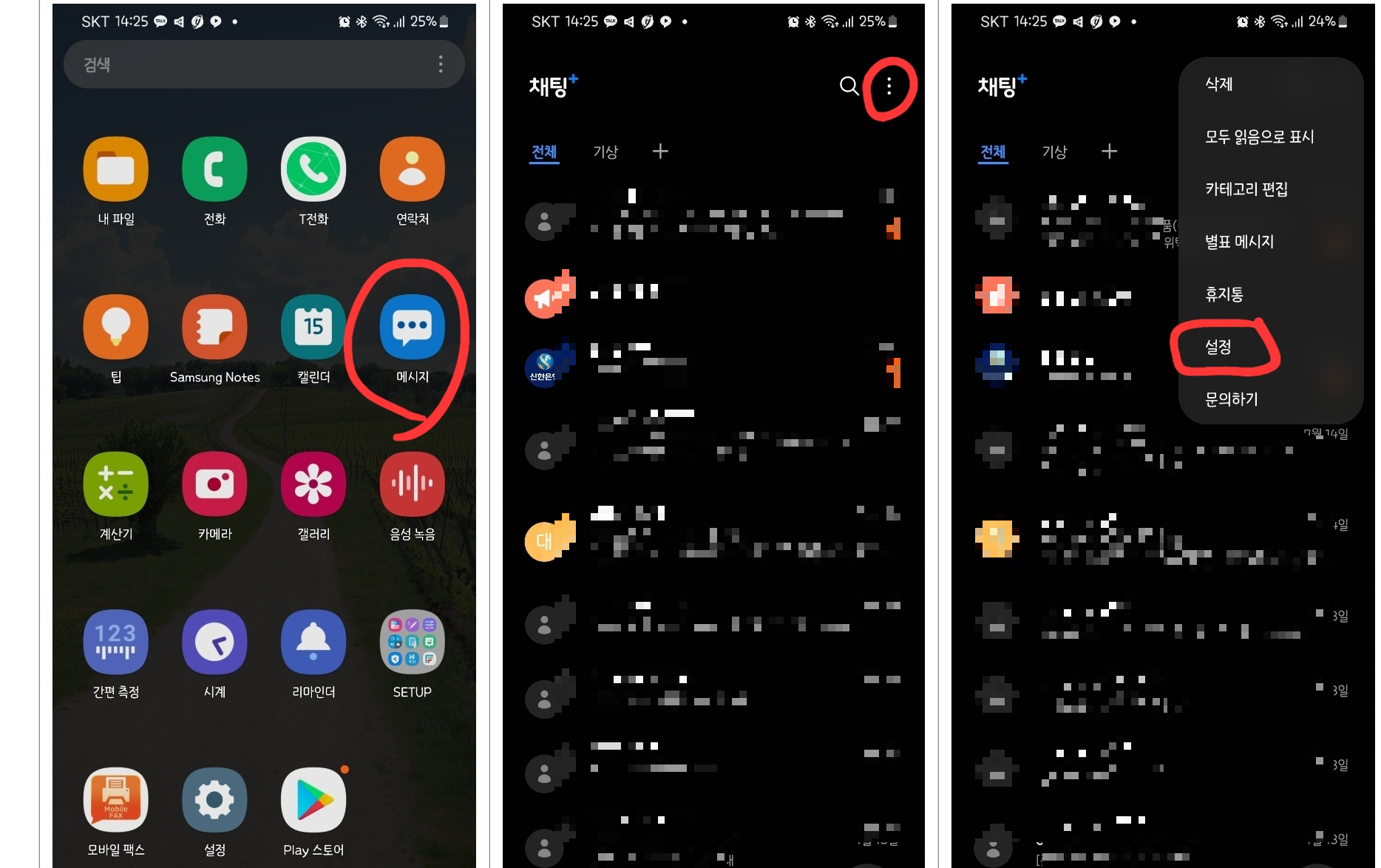 “문자 메시지”로 들어가 “돋보기” 옆에 “점 세 개”를 눌러서 “설정”을 눌러줍니다.