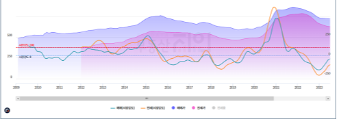 위의 표를 기준으로 2023년 7월 기준으로 매매가와 전세가가 동반 상승하는 이 시기가 매수하기에 적절하다고 볼 수가 있습니다.