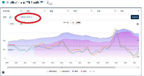 전세지수와 매매지수라는 표도 볼 수가 있는데 지수란 가격이 아니라 '변화량'을 나타냅니다. 즉, 지수는 변동폭을 보여주는 것이지, 그것을 통하여 '싸다 비싸다'의 판단은 어려울 수가 있다는 점을 참고하시기 바랍니다.