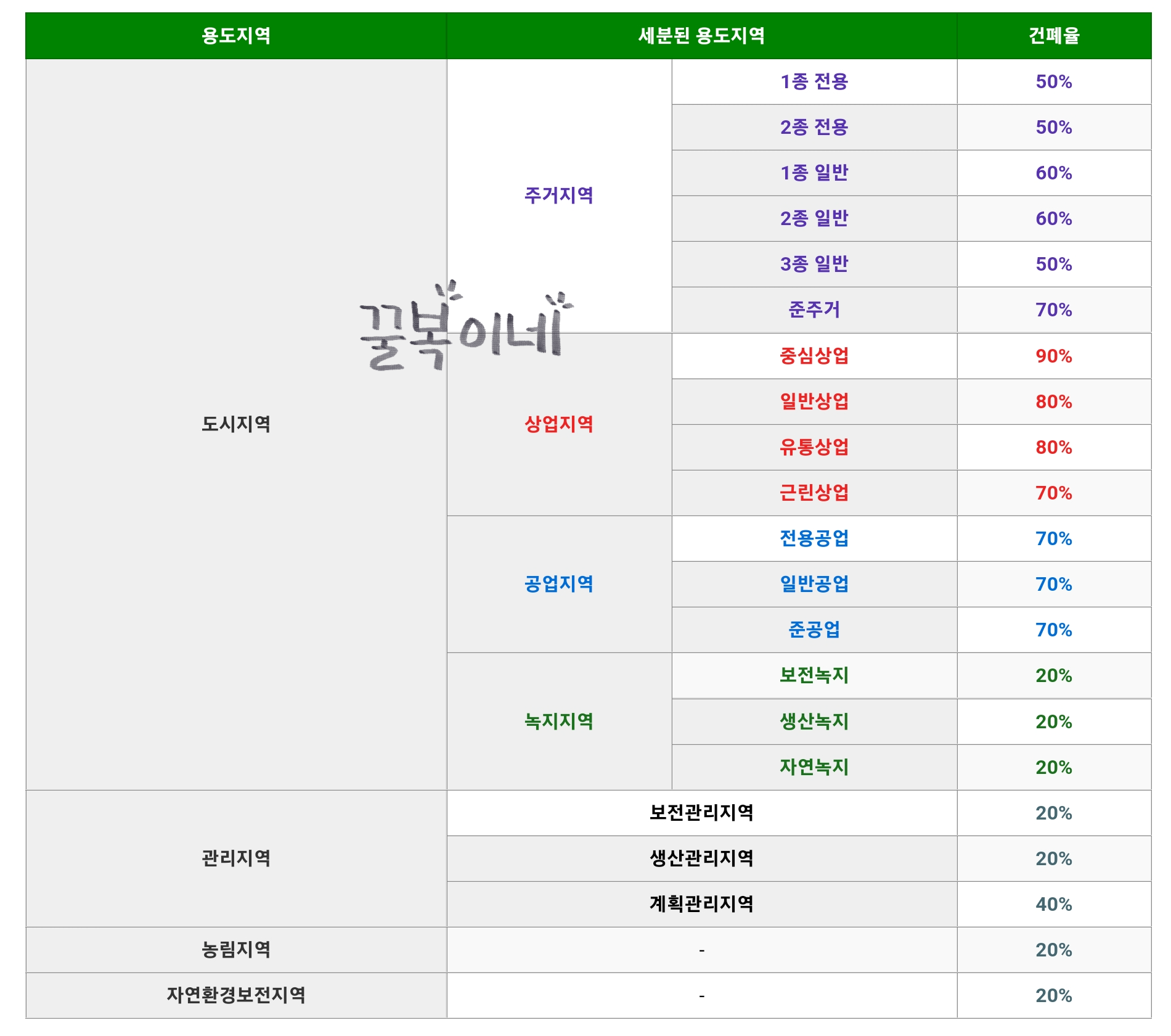 건폐율 최대한도는 다음과 같습니다.
