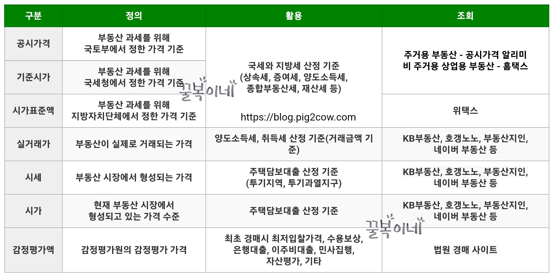 이번에는 부동산 가격 종류에 대한 주제로 정리해 보았습니다. 부동산 가격의 대표 지표인 공시가격, 기준시가, 시가표준액, 실거래가, 시세, 시가, 감정평가액에 대하여 최대한 이해가 쉽고 빠